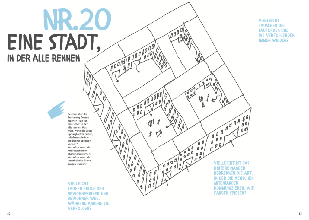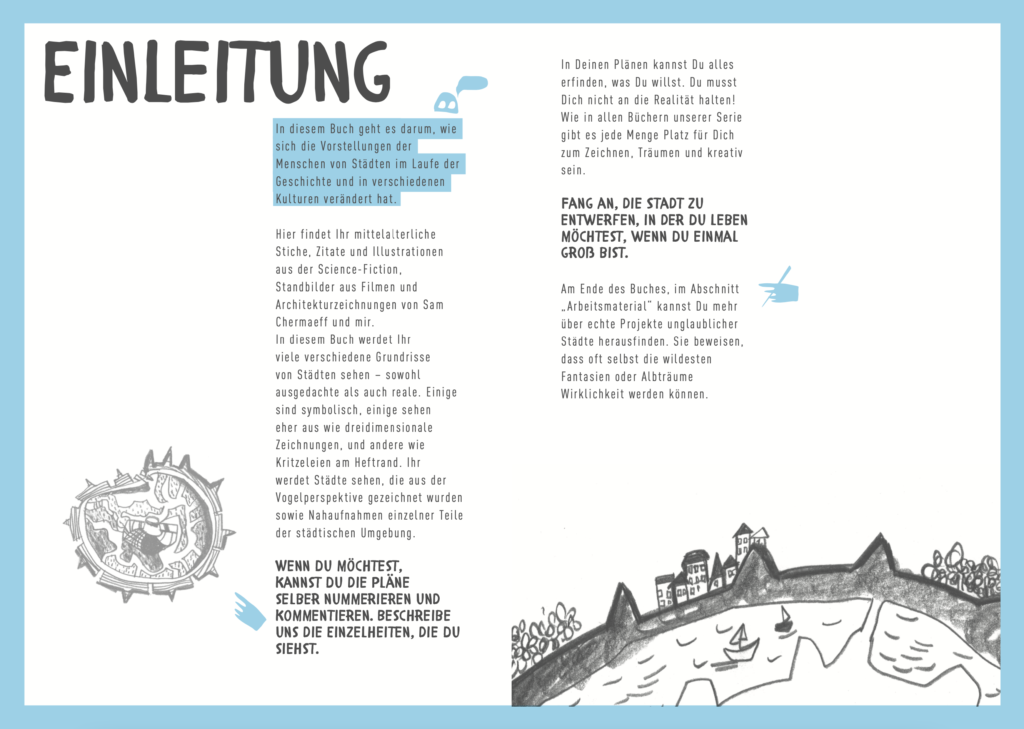 Wie haben sich die Vorstellungen der Menschen von Städten im Laufe der Geschichte und in verschiedenen Kulturen verändert? Das Kinderbuch – das übrigens auch für Erwachsene spannend ist – entführt in 30 historische oder erfundene Städte und lädt kleine und große Kinder dazu ein, deren Gestalt und Regeln weiter zu entwickeln. Neben mittelalterlichen Stichen, Zitaten und Illustrationen aus der Science-Fiction können Standbilder aus Filmen und Architekturzeichnungen von Sam Chermaeff und Nika Dubrovsky entdeckt werden. Konzipiert als Mitmachbuch, in dem gemalt, gezeichnet und geschrieben werden kann, zeigt die Neuerscheinung nicht nur die Vielfalt städtischer Lebensweisen im Laufe der Geschichte und in verschiedenen Kulturen. Es regt auch dazu an, gemeinsam Ideen und Pläne zu entwickeln, wie städtisches Leben gerechter, schöner und inklusiver gestaltet werden kann.