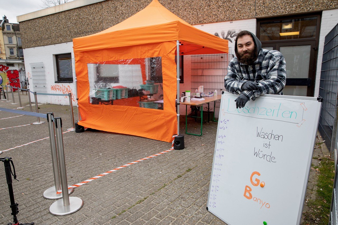 Wohnungslose Menschen können an drei Tagen in der Woche in einem Corona-bedingt geschlossenen Schwimmbad duschen. Das Projekt wird ermöglicht durch eine Kooperation zwischen der Sozialbehörde Hamburg, der gemeinnützigen Initiative GoBanyo, die einen Duschbus betreibt, und Bäderland Hamburg.