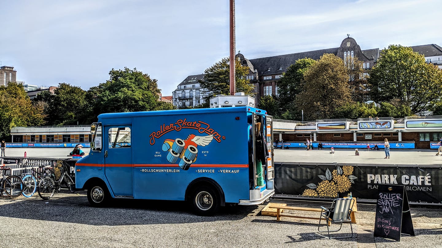 Beide sind nicht nur passionierte Rollerskate-Jam-Fans, sondern auch Veranstalter*innen. Ihre Roller-Skate-Jam-Reihe im Mojo Club ist in Hamburg legendär. Schon lange versuchen sie, eine Genehmigung für den Verleih von Rollschuhen an der Rollschuhbahn im Park Planten un Blomen zu bekommen. Bislang vergeblich. Doch im Corona-Sommer 2020 wurde ihre Idee endlich Realität. Denn das Bezirksamt erkannte nun den Wert dieser Initiative, noch mehr Menschen die Möglichkeit zur kontaktlosen Bewegung draußen zu ermöglichen.